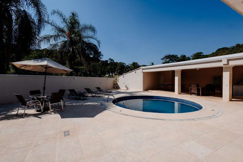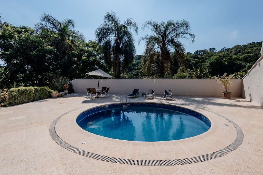 - Piscina redonda de alvenaria, revestida com pedras Castelato, aquecida por trocador de calor, iluminada com grande solário e casa de máquinas.