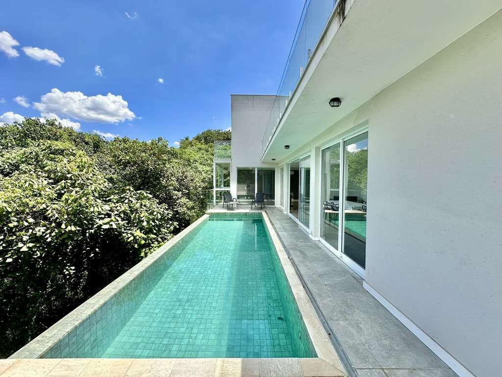- Piscina elevada sobre pilotis (8,00 m de altura) com borda infinita, ducha, solário e vista para um bosque particular. Com infraestrutura preparada para aquecimento (solar), revestida em pastilhas cerâmica tipo pedra Hijau e iluminação com controle de cores.